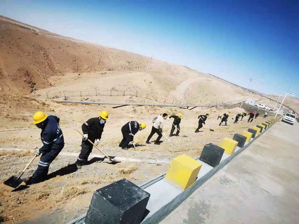 本次活動(dòng)重點(diǎn)對(duì)基礎(chǔ)壩兩側(cè)坡面進(jìn)行綜合治理,治理長(zhǎng)度約1.5公里。面對(duì)坡陡、風(fēng)大、黃沙亂舞的工作環(huán)境,黨員干部不懼困難、以身作則、俯沖一線,帶頭撿拾垃圾、清理尾砂、覆土灑水以及對(duì)安全警示牌進(jìn)行維護(hù)保養(yǎng)。廣大職工緊跟其后,或一字排開(kāi),或矩陣展開(kāi),忙碌的身影遍布整個(gè)坡面,鏟車的轟鳴聲、鐵锨的吱吱聲與狂風(fēng)的呼嘯聲琴簫合奏,在藍(lán)天、斜陽(yáng)和荒山的襯托下,勾勒出一幅“聲與色”、“動(dòng)與靜”相得益彰的勞動(dòng)生產(chǎn)畫卷。